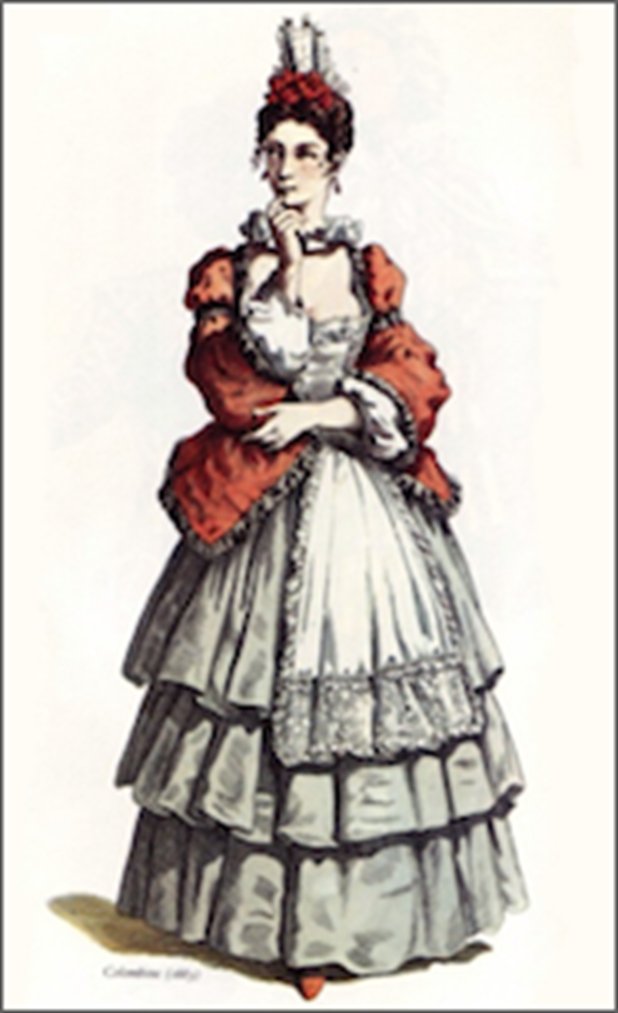 MAQUILLAGE : Comme toutes les femmes de la Commedia dell’arte, elle ne porte pas de masque, mais adopte un maquillage marqué : le visage peint en blanc, les joues rosées et les yeux et lèvres soigneusement soulignés.