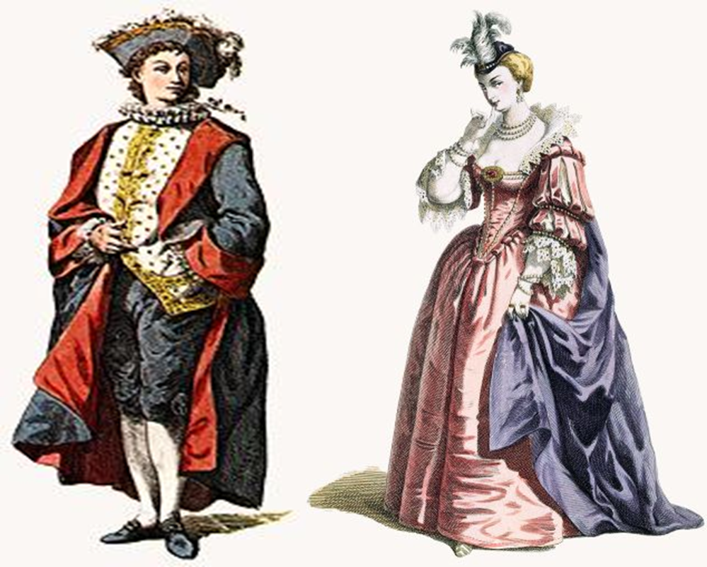 COSTUME : habit noir ajusté sur un gros ventre, fraise blanche autour du cou, calot noir et souliers noirs à boucles.